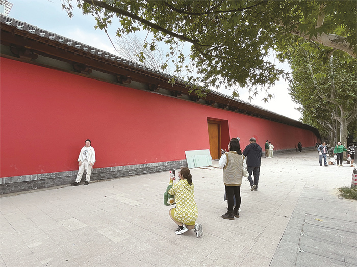 虽然是工作日的下午,但在德寿宫“网红墙”下拍照的人络绎不绝。