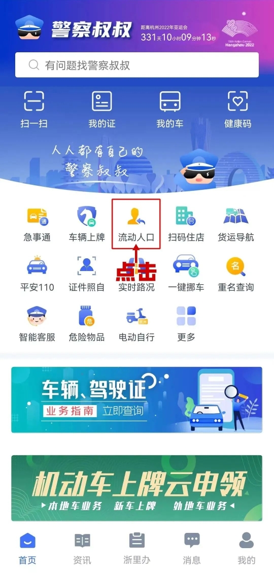 第二步:实名认证登录后,在“警察叔叔”APP首页点击进入“流动人口”栏目。