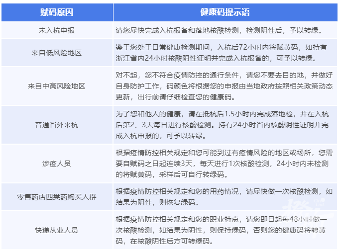 近期国内多地发生本土新冠肺炎疫情,为了进一步强化涉疫风险人员管理,省、市对有高、中、低风险地区旅居史或未完成入杭报备、未按时进行“落地检”“三天三检”以及购买四类药品等相关人员进行赋码管理,并针对不同赋码类型,在健康码下方进行相应文字提示,督促其落实相关健康管理措施。