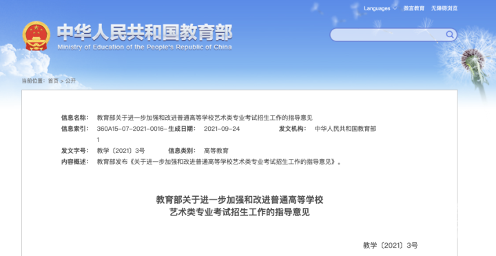 这一变化,与2021年9月教育部发布《关于进一步加强和改进普通高等学校艺术类专业考试招生工作的指导意见》有关。