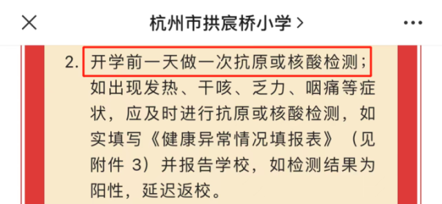 也有学校提到,开学前一天做一次抗原或核酸检测;如出现发热、干咳、乏力、咽痛等症状,应及时进行抗原或核酸检测,如实填写《健康异常情况填报表》并报告学校,如检测结果为阳性,延迟返校。