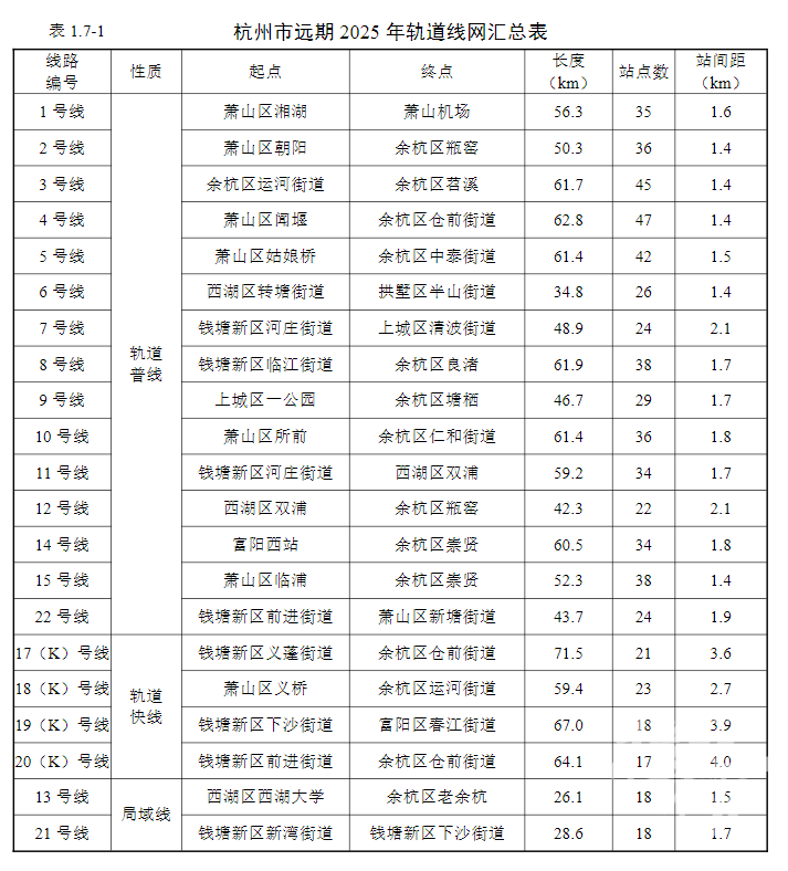 根据规划内容,到2035年,杭州将形成包含4条轨道快线(共262公里)、15条普线(共804.2公里)、2条局域线(共54.7公里)的轨道交通线网。