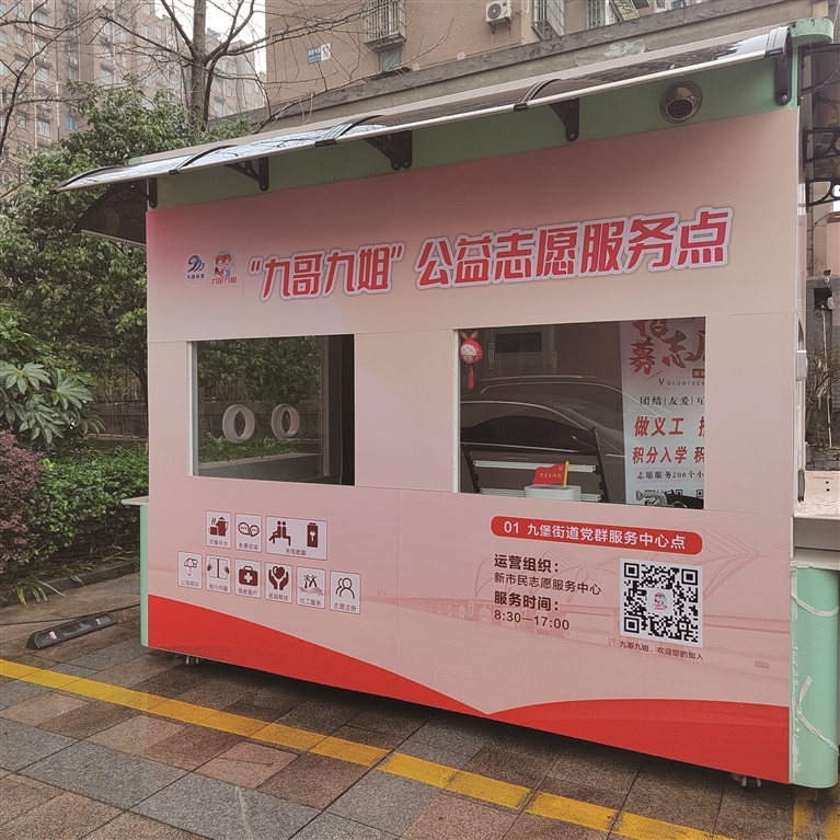 时间:2月9日 地点:九堡街道党群服务中心 九堡街道党群服务中心前的核酸亭近日也穿上了“新衣服”。亭子上标着“九哥九姐”公益志愿服务岗,也是党员志愿先锋岗。站点内后续可为市民提供开水、咨询、充电、雨伞、书刊、紧急医疗等服务。
