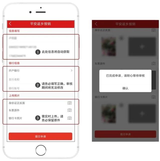 填写银行卡信息并上传身份证正反面、车票原件、银行卡照片(均需实时拍摄上传),确认无误后即可提交申请,信息一旦提交将不可修改,请务必准确填写。