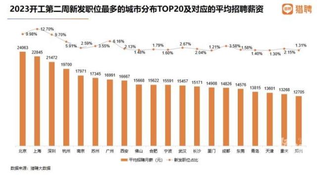 从对应的平均招聘薪资来看,北京、上海、深圳分别以24063元/月、22845元/月、21472元/月位居前三。杭州开工第二周新发职位的招聘平均薪资为19700元/月。