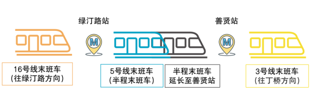 5号线金星站始发半程末班车延长至善贤站,并调整金星站始发时间至23:11,这样一来,搭乘16号线末班车从临安前往绿汀路方向的乘客不仅可以在绿汀路站换乘5号线末班车,还可以在善贤站换乘3号线末班车(往丁桥方向末班车23:59)。