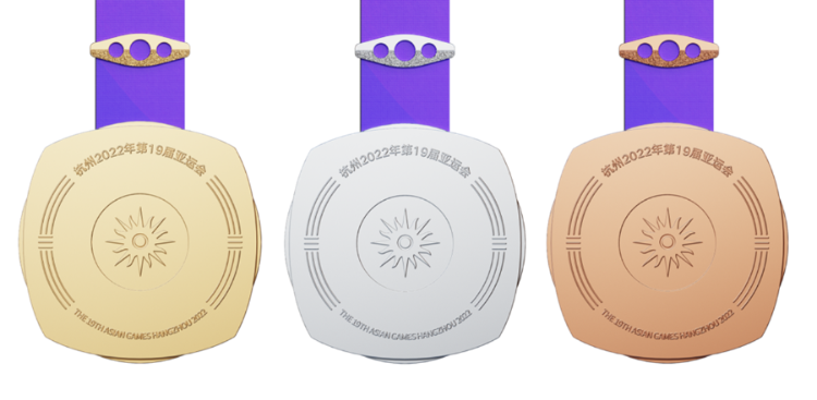 奖牌背面形似方形印章,亚奥理事会的太阳图形置于正中,上下以中英双语刻以杭州亚运会文字标识,寓意运动员们在杭州亚运会上留下美好的印记。