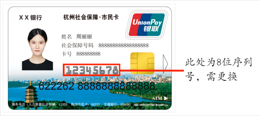 若已经为第三代社会保障卡(市民卡),卡面无序列号,无需更换。卡面长这样 ↓↓