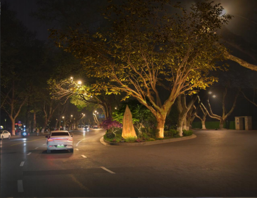 暖色光凸显雕塑,背景局部绿化照明与萤火虫灯点缀。