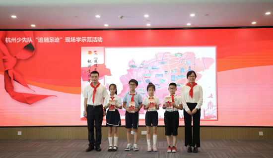 现场,杭州市文明办副主任罗来庚、共青团杭州市委副书记、市少工委主任马君雅向少先队员赠送“‘追随足迹’现场学”活动地图。