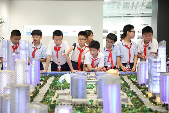 少先队员们走进市政协新时代协商民主实践中心,在讲解员的带领下走到展厅中央摆放着的钱江新城沙盘前。