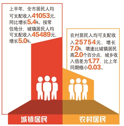 上半年,全市居民人均可支配收入41053元,同比增长5.4%。按常住地分,城镇居民人均可支配收入45489元,增长5.0%;农村居民人均可支配收入25754元,增长7.0%,增速比城镇居民高2.0个百分点,城乡收入倍差为1.77,比上年同期缩小0.03。