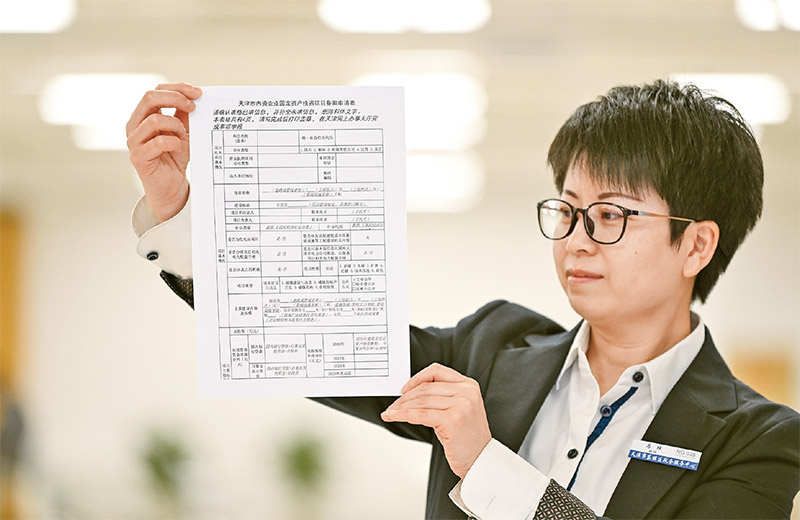 近日,天津市东丽区政务服务中心创新推出了“丽企办—填空式”自助申报举措。通过为企业提供行政审批标准化模板,实现企业办事由做“问答题”向做“填空题”的转变,助力营造良好营商环境,服务民营经济发展。图为政务服务中心工作人员向记者展示“填空式”项目申报表。 新华社记者 孙凡越/摄