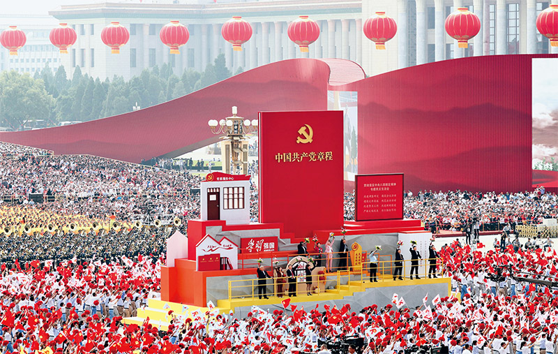 坚定不移,将全面从严治党进行到底。图为2019年10月1日上午,庆祝中华人民共和国成立70周年大会群众游行队伍中的“从严治党”方阵。 新华社记者 兰红光/摄