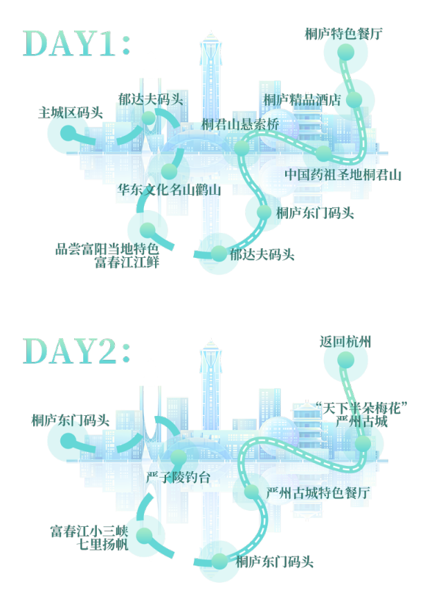 在桐庐东门码头登船,经富春江船闸过闸体验、江南龙门湾、富春江小三峡、七里扬帆,至澄清门码头上岸。严州古城距今已有1700余年,它因古城墙筑梅花形而得名,古有“天下梅花两朵半,独有半朵在梅城”的说法。