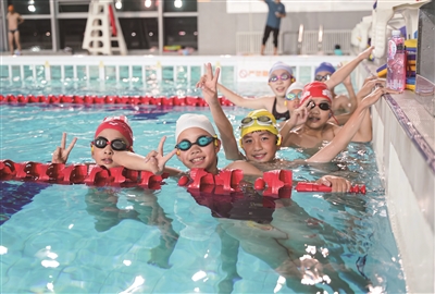 黄龙体育中心游跳馆二楼,一群小朋友正在进行游泳训练